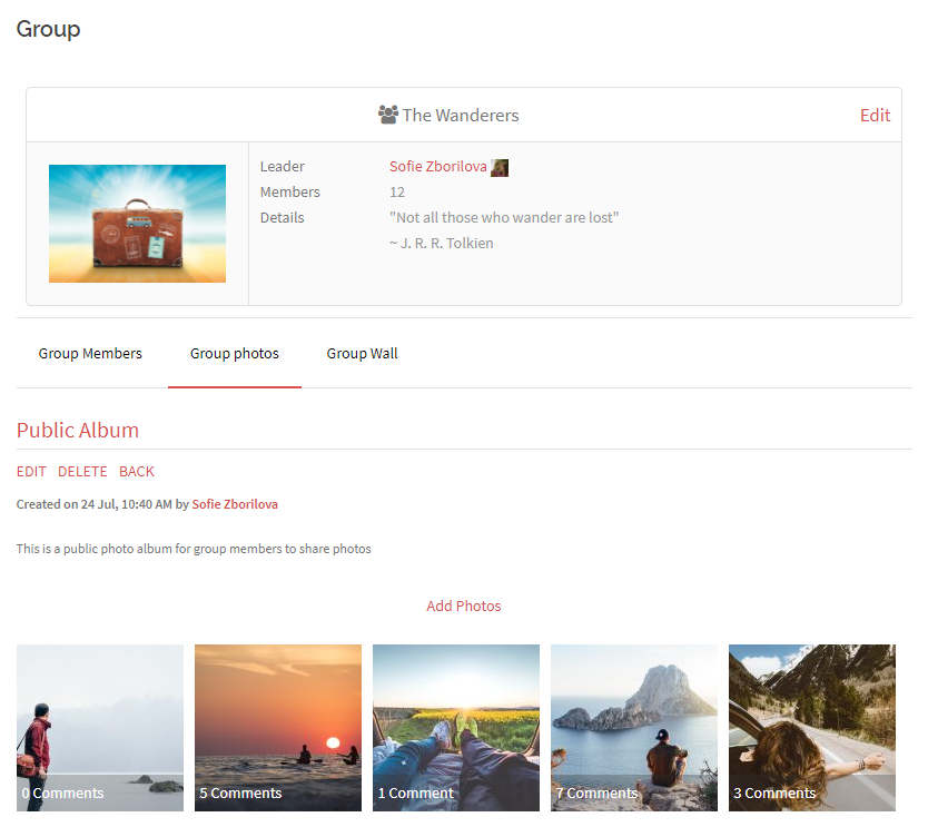 Allow your users to create and share Photo Albums within their Groups. There's also an option for public photos. Users can enlarge and comment on different photos.