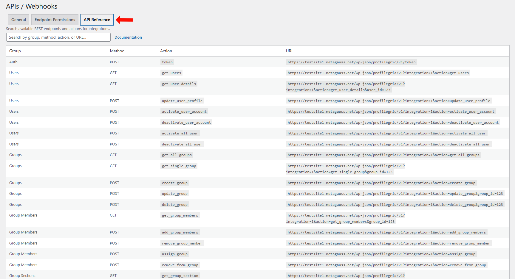 ProfileGrid includes an API Reference tab under APIs / Webhooks, which provides a complete list of all available REST API endpoints.