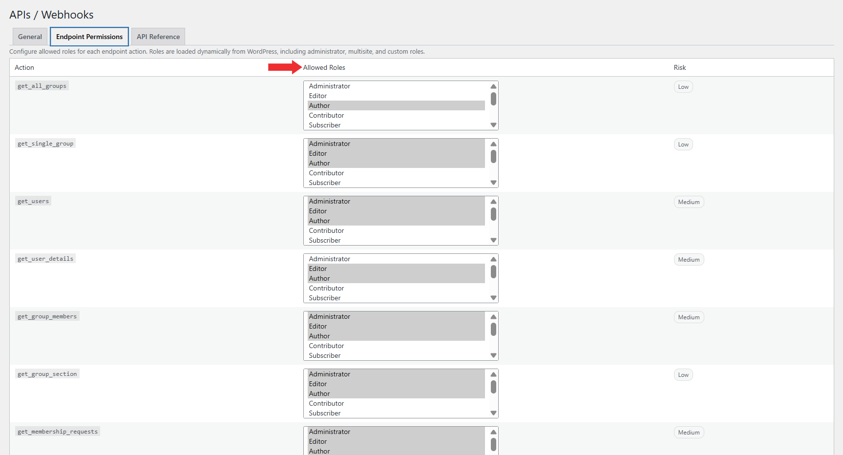 ProfileGrid provides an additional authorization layer through the Endpoint Permissions tab available under APIs / Webhooks. This allows administrators to control which WordPress user roles are allowed to access specific REST API actions.