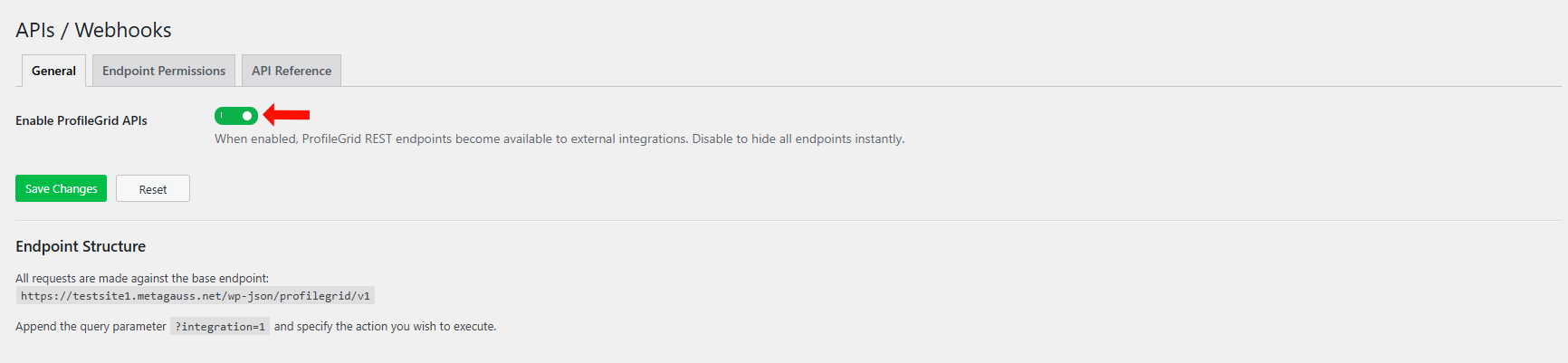 - On the APIs / Webhooks Settings page, enable the toggle for Enable ProfileGrid APIs.